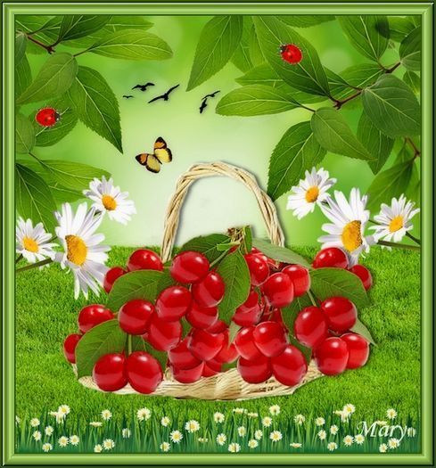 Bonjour Mary, ah hier je te parlais des cerises de mon jardin.....en voilà un beau panier, je crois que les enfants vont venir les cueillir en fin de semaine sinon les oiseaux et la pluie va toutes les abimées. Bonne journée a toi. Bisous de nicolette.http://leblogdenicolette.centerblog.net